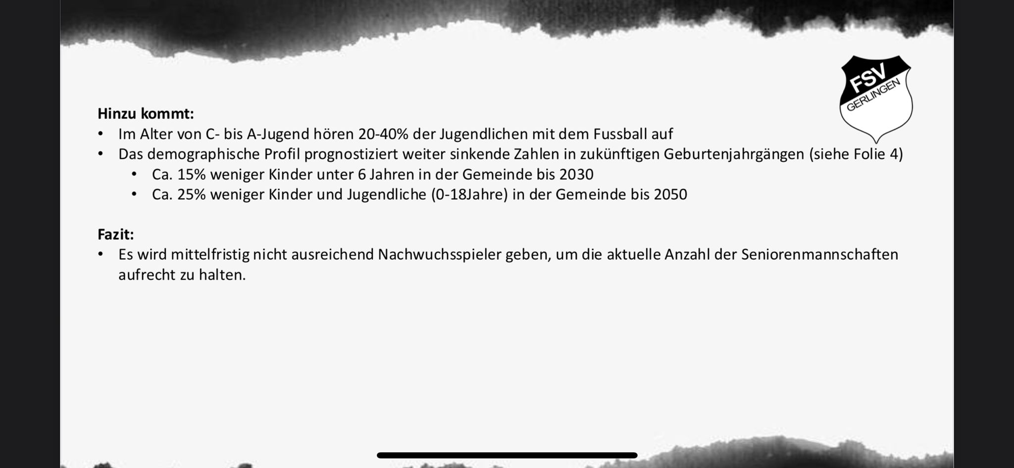 Auch ein Blick in die Zukunft ist ernüchternd: Laut Kommunalprofil der Gemeinde wird bis 2030 ein Rückgang der unter 6-Jährigen um rund 15 % erwartet. Bis 2050 wird sogar mit einem Rückgang von ca. 25 % bei Kindern und Jugendlichen unter 18 Jahren gerechnet. Das bedroht nicht nur den Jugendbereich, sondern perspektivisch auch den gesamten Spiel- und Trainingsbetrieb.