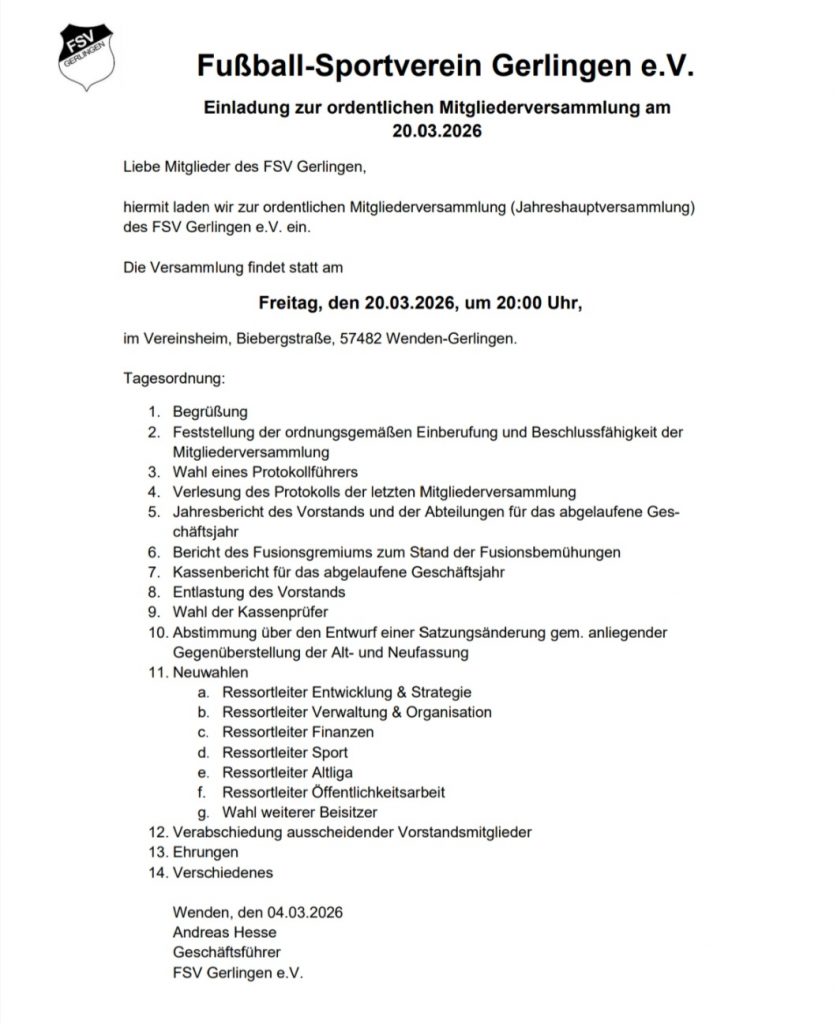 Neben den üblichen Tagesordnungspunkten steht dieses Jahr auch ein Bericht des Fusionsgremiums sowie wichtige Änderungen in der Vereinssatzung auf dem Programm.
