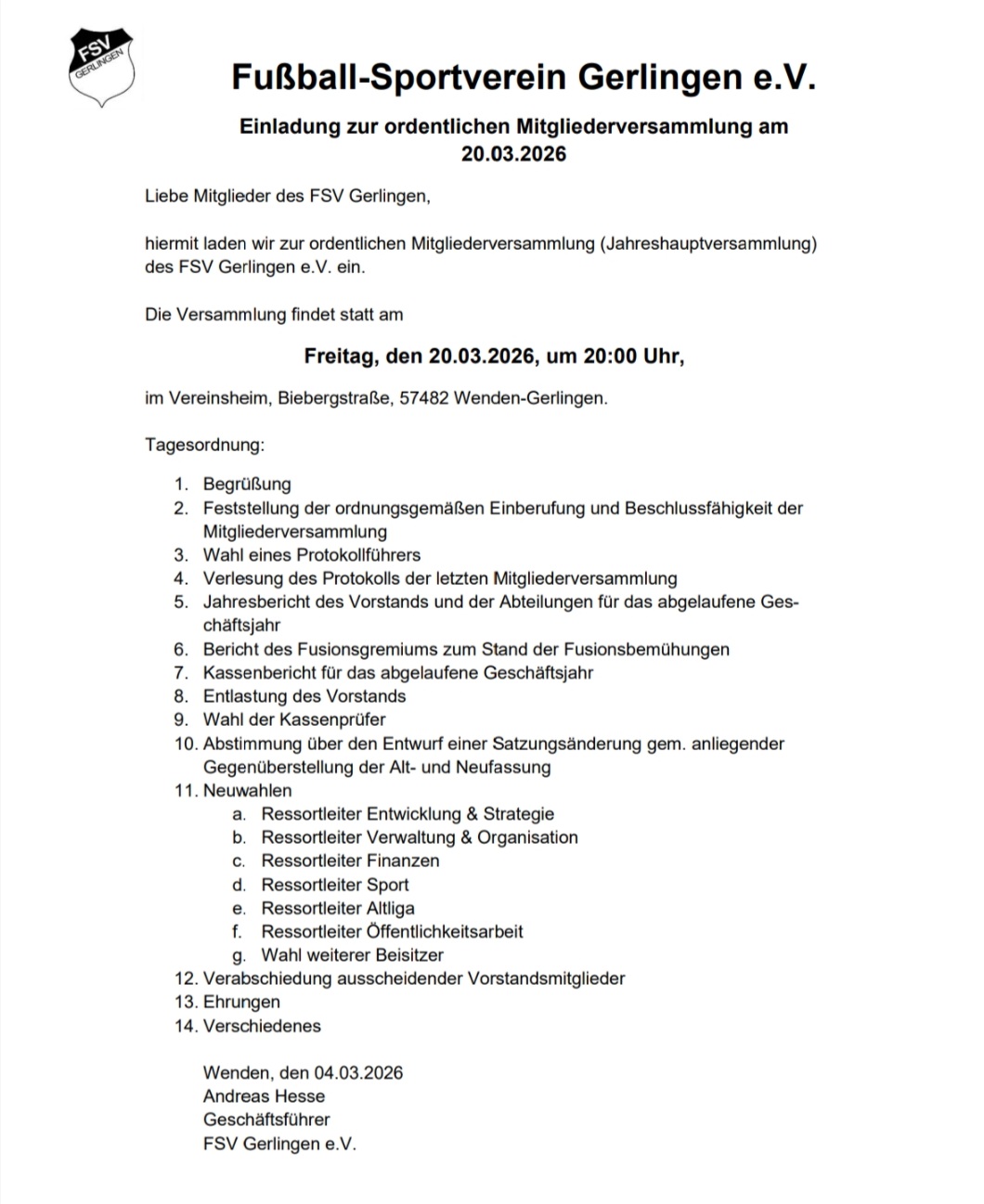 die diesjährige Jahreshauptversammlung findet am Freitag, den 20.03.2026, um 20:00 Uhr, im FSV-Treff statt.